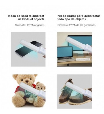 Mini lámpara UVC plegable portátil. Esterilización germicida 99%. Dispone de botón de encendido en la perte trasera. Para todo tipo de superficies. Tamaño compacto que facilita su transporte. Vida útil: hasta 8.000 Horas. Funciona con 4 pilas AAA o mediante cable USB. Duración de la batería: de 1 hora a 3 horas Temperatura de trabajo: 0ºC - 60ºC PVC Aleación_de_Metal