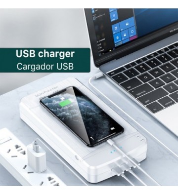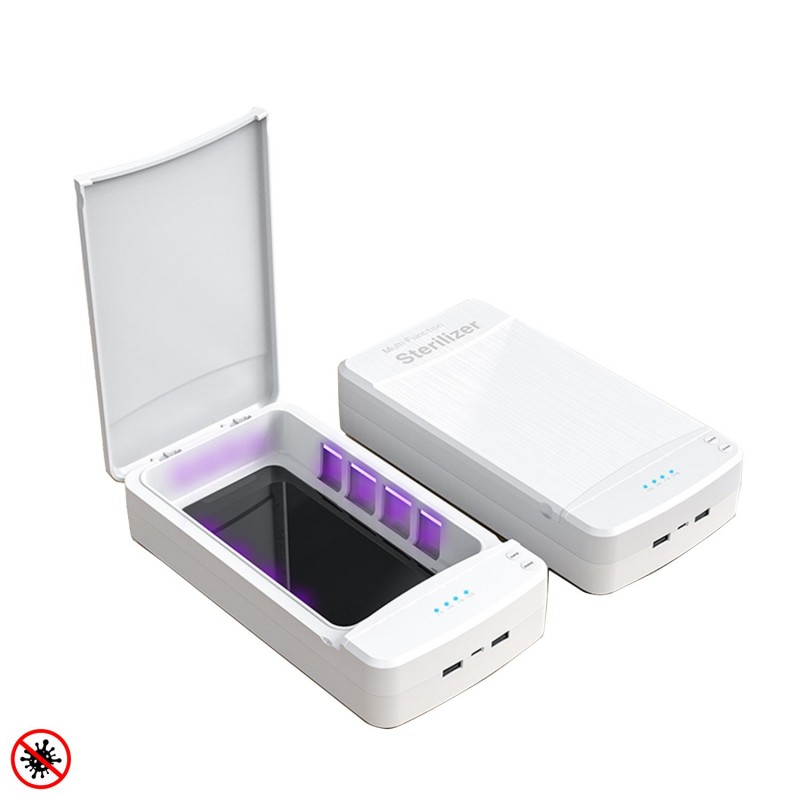 Caja esterilizadora portatil con luz ultravioleta. • No se utilizan líquidos, calor ni productos químicos, por lo que es seguro desinfectar cualquier cosa que quepa en su interior. La luz UV-C puede llegar a los microorganismos que se esconden en grietas donde ni siquiera las toallitas de limpieza pueden llegar. • Este producto no solo es adecuado para la mayoría de los teléfonos inteligentes, sino también para la desinfección de máscaras, relojes, joyas, gafas, llaves, chupetes, platos, ropa interior y otros objetos pequeños. • Dispone de función desinfeción y aromaterapia. • Leds indicadores del porcentaje de desinfección realizado. • Dispone de salida de USB para carga de dispositivos móviles durante el proceso de desinfección. Input voltage: DC5V Input current: 1A Longitud de Onda: 253,7nm Proceso de desinfección completo: 3min PVC Aleación_de_Metal