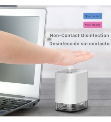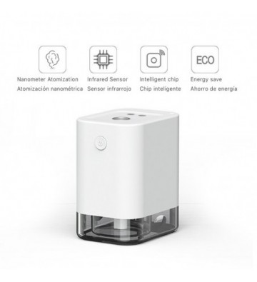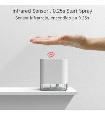 Dispensador Inteligente automático. • Sensor infrarrojo. • Nebulización vertical. • Compatible con hidrogel alcohólico. • Depósito de 50 ml. • Batería recargable 1800 mah. Voltaje: 5V Tensión: 500mAh Distancia de detección máxima: 12cm Capacidad: 50ml ABS Aleación_de_Metal
