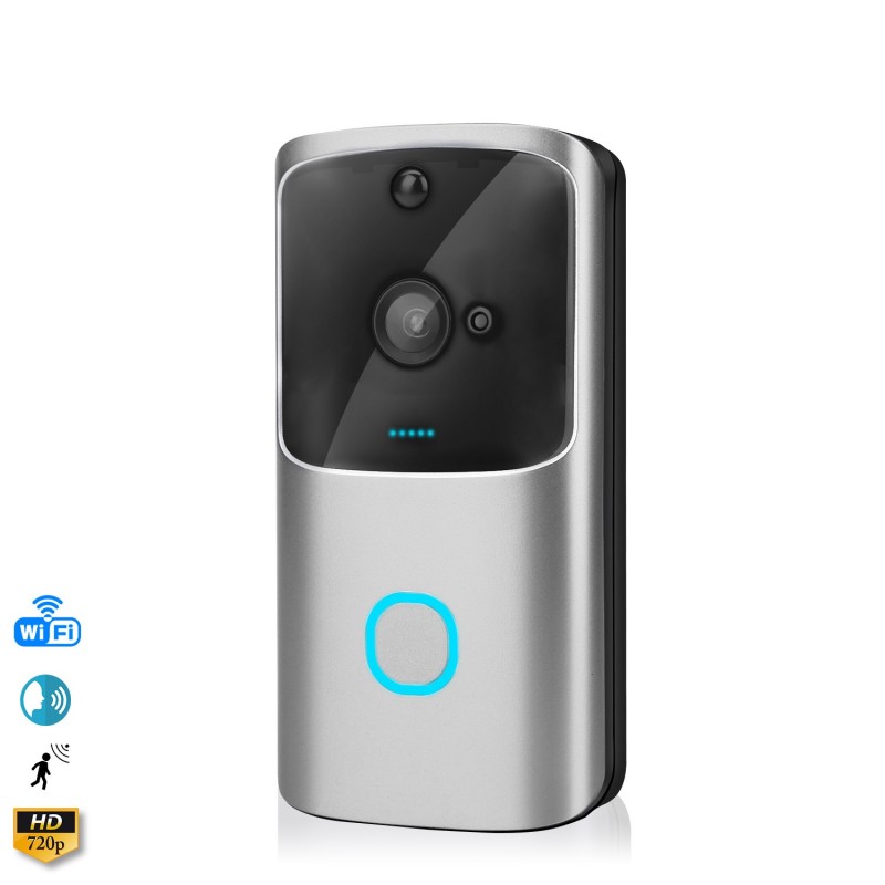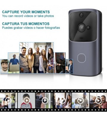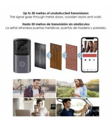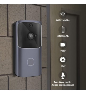 Video portero inteligente inalámbrico M10 HD 720p. • Conexión inalámbrica, potencia ultra baja, activación remota, inicio rápido. • Llamada bidireccional: podrás comunicarte con el llamante gracias al altavoz y micrófono. • Los visitantes pueden hacer videollamadas y audio y hacer grabaciones de vídeo cortas. El anfitrión puede conocer la información sin abrir la puerta. • Detección de movimiento: con 3 niveles de sensibilidad ajustables, grabación de video y notificación en teléfono móvil. • Visión nocturna gracias a la luz infrarroja de alta potencia, visión de hasta 10 metros. • 3 modos de activación: con el botón del timbre, inicio automático con la detección humana PIR, con el teléfono móvil. • Activación rápida en 3/5 segundos. • Usuarios en línea: varios usuarios en línea simultáneos. • Rendimiento del sensor: balance de blancos automático, control automático de ganancia, compensación automática de retroiluminación. • Fuente de alimentación: funciona con 3 baterías 18650 (no incluidas). Hasta 9 meses de duración. Fuente de alimentación: baterías 3x18650 (no incluida). Tensión de fuente de alimentación: 8-25 V. Tonos de llamada: alto. Consumo de energía: ± 170 mAh. Relación señal/ruido: ≥ 39 dB. Lente/ángulo de visión: 0.067 in a F2,4/166°. Visión nocturna: doble filtro de conmutación automática, luz infrarroja de alta potencia, noche 10 m aprox. Resolución: HD 720P. Intercomunicador: Intercomunicador de voz bidireccional, con cancelación de eco Red inalámbrica: 802.11B/G/N - 2,4GHz Seguridad de red inalámbrica: cifrado de seguridad WPS Almacenamiento: almacenamiento de tarjeta micro SD hasta 32GB. PVC Aleación_de_Metal